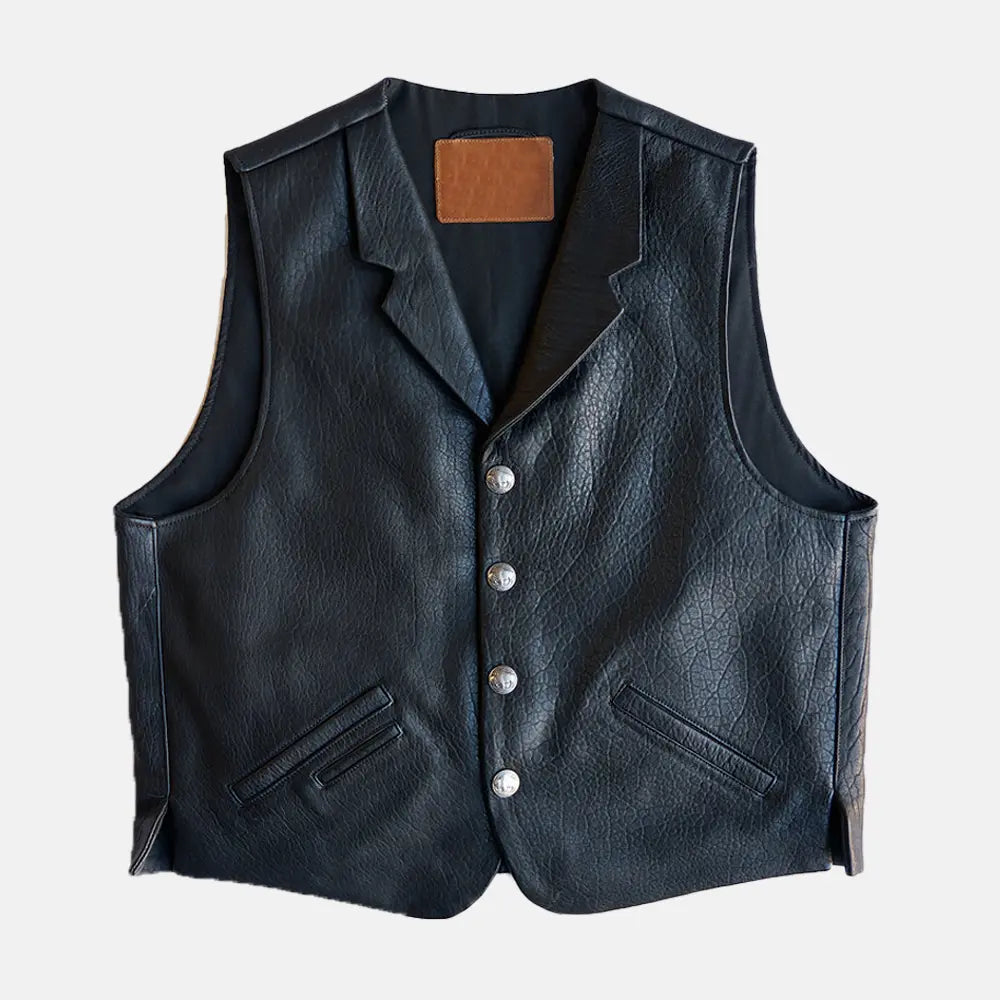 The Nikolai Black Leather Vest comes in a solid black color, so it’s a bold choice. It pairs easily with different outfits, for a night out or keeping it casual.